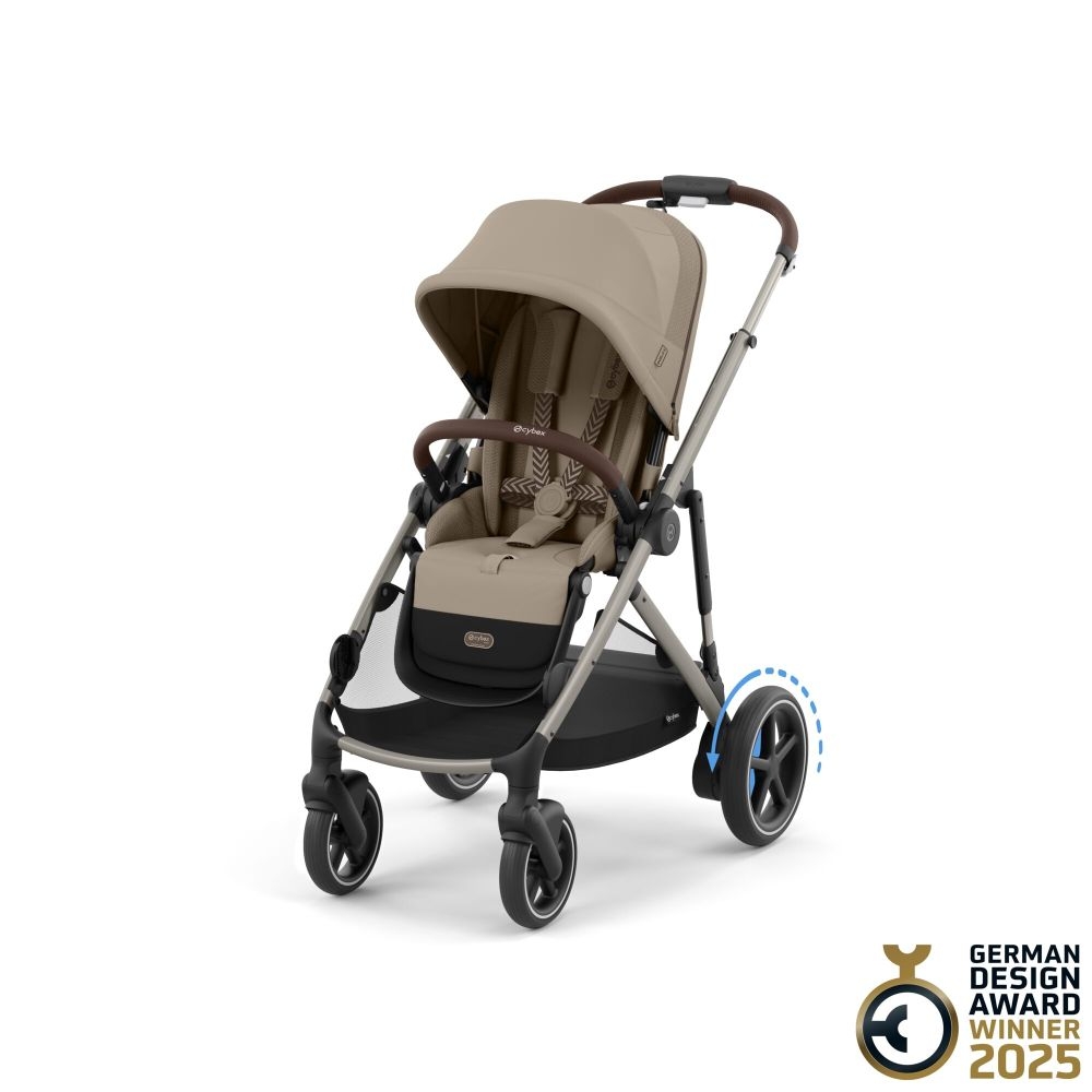 Pachetul 3 in 1 include: Noul Cybex e-Gazelle S electric cu cadru taupe cu maner de piele, Cos Cumparaturi, 2 Parti Sport model nou Almond Beige, 2 Landouri Almond Beige, 2 scoici Cybex Cloud G plus I-size Recline testate ADAC, adaptori scoici, baterie si incarcator.