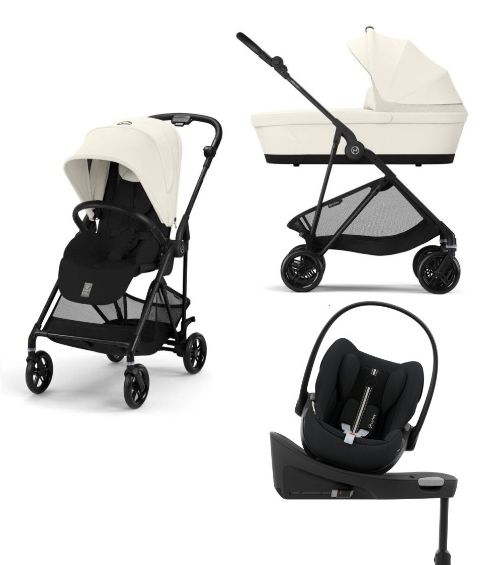 Setul include: Noul Cybex Melio Carbon ultrausor Canvas White colectia 2025 + Landou Cybex Melio, Scoica Cloud G Plus i-Size Recline,adaptori si baza isofix rotativa.