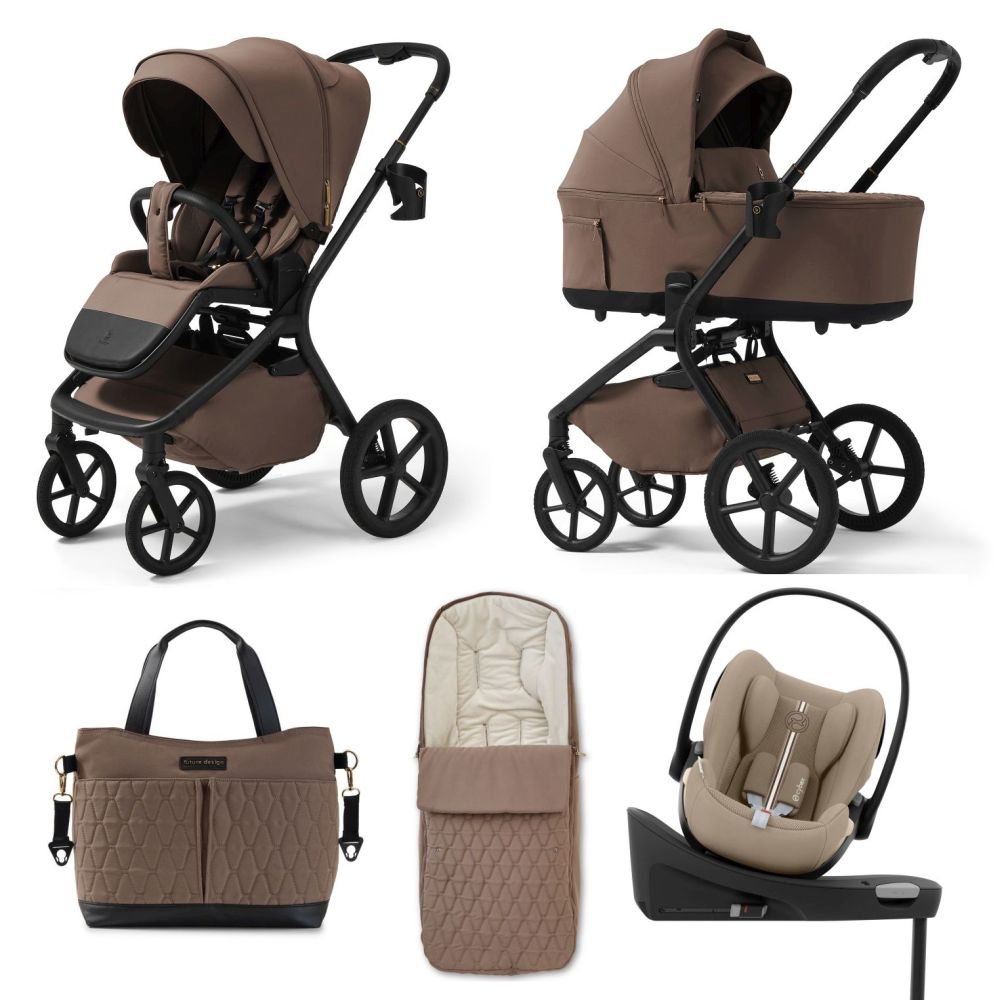Setul include: Noul Future Design Inspiro Essential Mokka sport + landou, scoica Cybex Cloud G Plus i-size recline testata ADAC + adaptori, husa de ploaie, protectie anti-insecte landou/sport, sac de iarna, geanta mamicii si baza isofix rotativa, pe care mai tarziu se cupleaza scaunul Cybex Sirona.