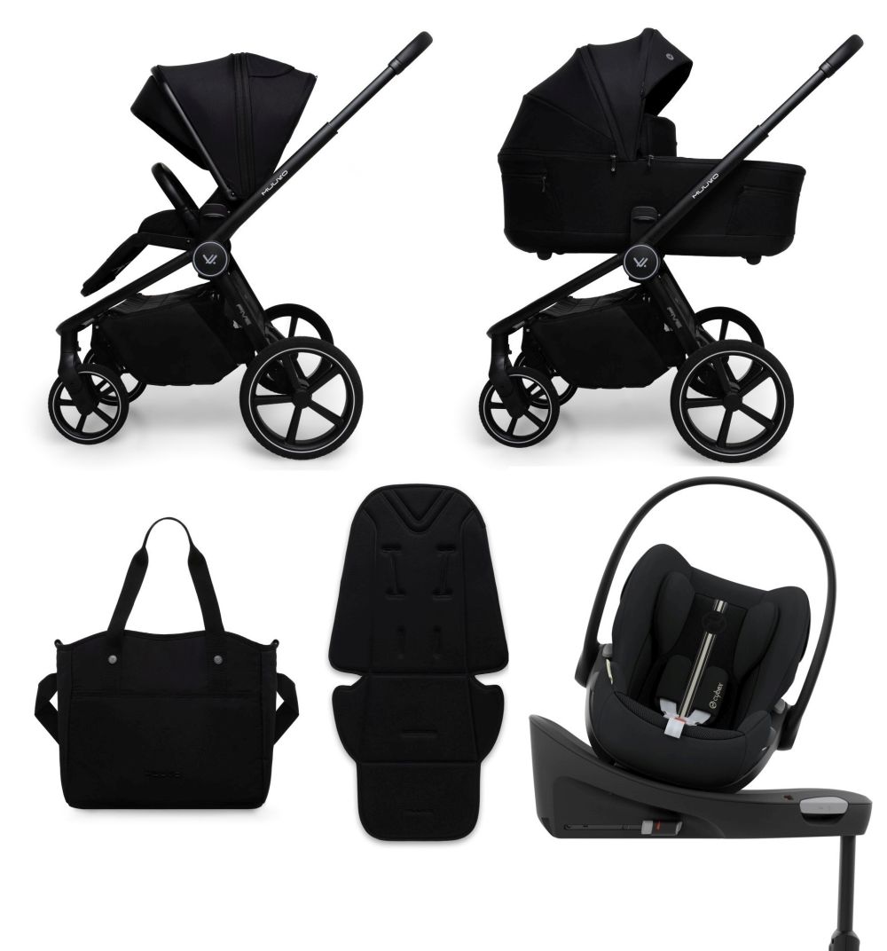 Setul include: Noul Muuvo Five Black + landou, scoica Cybex Cloud G Plus i-size recline testata ADAC + adaptori, husa de ploaie, protectie anti-insecte landou/sport, insertie din spuma cu memorie, husa de iarna, geanta mamicii si baza isofix rotativa, pe care mai tarziu se cupleaza scaunul Cybex Sirona.